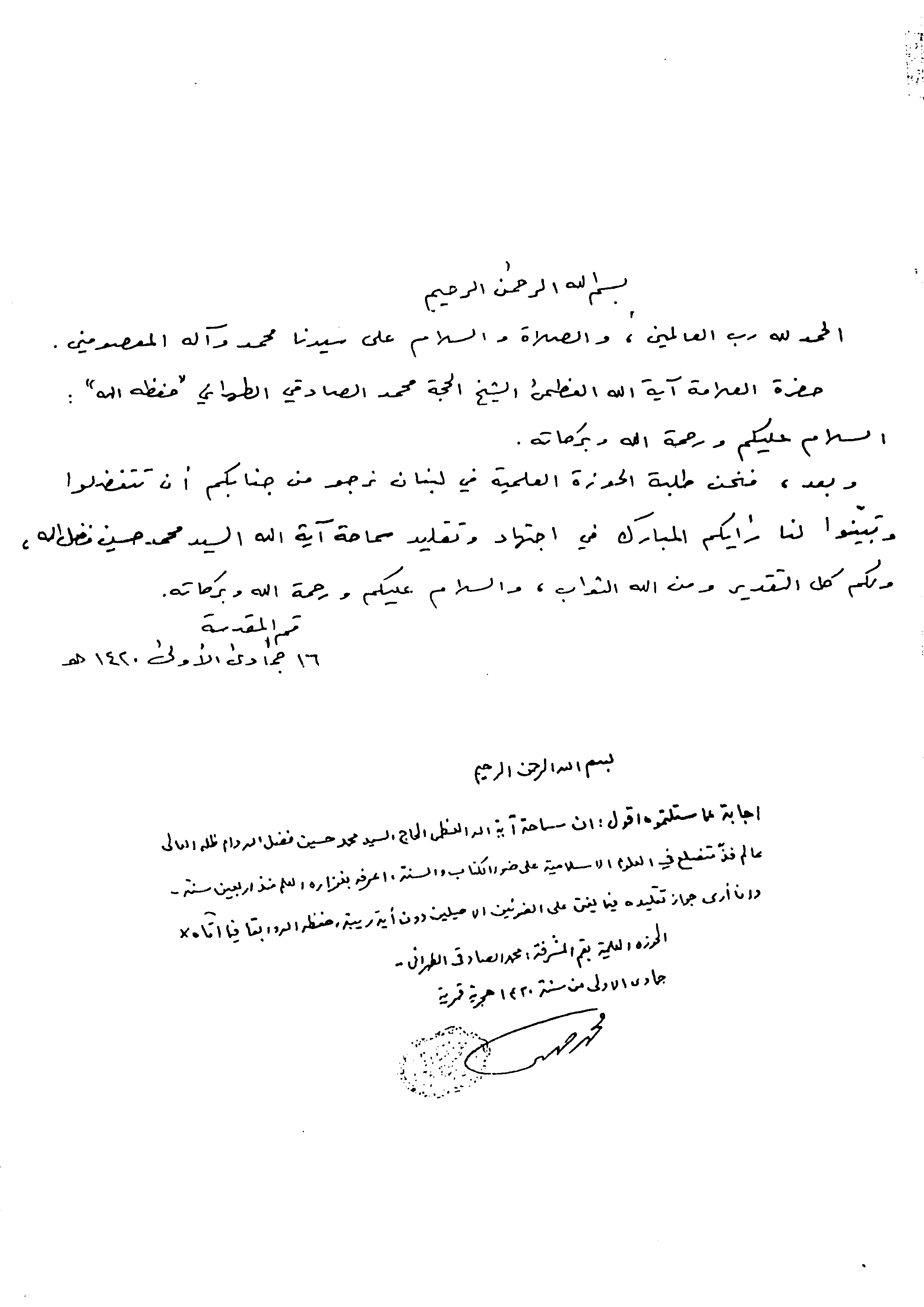 Əllamə Sadiqi Tehrani Livandakı Elmi Hövzə (Seminariya) tələbələrinin Ayətullah Seyid Fəzlullahın ictihadı və ona təqlid etməklə bağlı ona ünvanlanan suala belə cavab vermişdir: “Rəhman, Rəhim Allahın adı ilə! Sizin sualınıza cavab olaraq deyirəm ki, Ayətullahil-üzma Seyid Mühəmmədhüseyn Fəzlullah – Uca kölgəsi var olsun! – İslam elmlərini Kitab və Sünnə işığında çox yaxşı bilən nadir bir alimdır. Mən artıq qırx ildir ki, onu dərin bilgiyə sahib olan bir alim kimi tanıyıram. İki mənbəyə (Kitab və Sünnəyə) əsaslanaraq verdiyi fitvalarda ona təqlid etməyi heç bir şübhə olmadan icazəli hesab edirəm. Allah onu qorusun!”