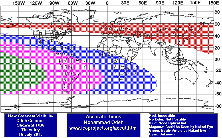 İzah: Bəyanata və 1436-cı il (m. 2015) şəvval ayı hilalının sxeminə diqqət etməklə məlum olur ki, 16 iyul axşam Günəş batarkən bizim ölkənin üfüqündə ayparanın görünməsi qeyri-mümkündür. Lakin gecənin bir hissəsində olsa da belə müştərək olduğumuz ölkələrin birində – tünd göy və çəhrayı rəngdə yerləşən ölkələrə baxın – ayparanın teleskopdan istifadə etməklə və adi gözlə görünməsinin mümkünlüyü ilə Seyid Fəzlullahın fitvasına əsasən bizim üçün də şəvval ayının əvvəli (Fitr bayramı günü) sübuta yetmiş olur.
