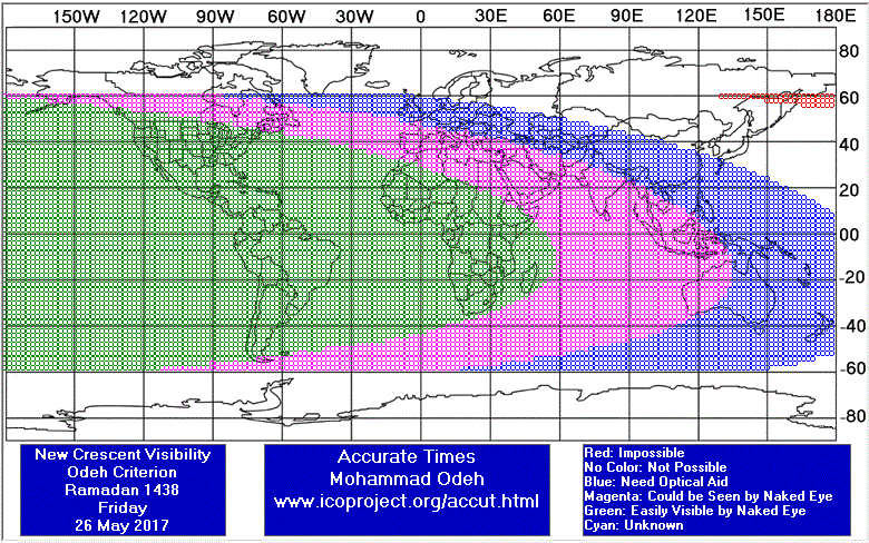 Şənbə gecəsi (cümə günü axşam) Şimali və Cənubi Amerikada və Afrika qitəsinin bir çox bölgələrində hilalın adi gözlə və asanlıqla görünməsi mümkün olacaqdır (sxemə diqqət edilsin). Həmçinin hava açıq və buludsuz olarsa, bizim ərəb və İslam bölgələrində də hilalın adi gözlə və həmin bölgələrin bəzilərində isə yaxınlaşdırıcı cihazlar vasitəsilə görünməsi mümkün olacaqdır.