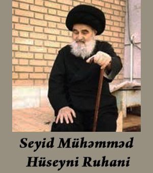 [6] Ayətullah Seyid Mühəmməd Hüseyni Ruhani (h. q. 1338, 22 şəban – 1418, 19 rəbiüləvvəl – m. 1920, 9 may – 1997, 25 iyul). O, İranın dini rəhbərlərindən olmuşdur. 1920-ci il 9 mayda Qum şəhərində doğulmuş və 1997-ci il 25 iyulda həmin şəhərdə vəfat etmişdir. Onun cənazəsi öz hüseyniyyəsində torpağa tapşırılmışdır.